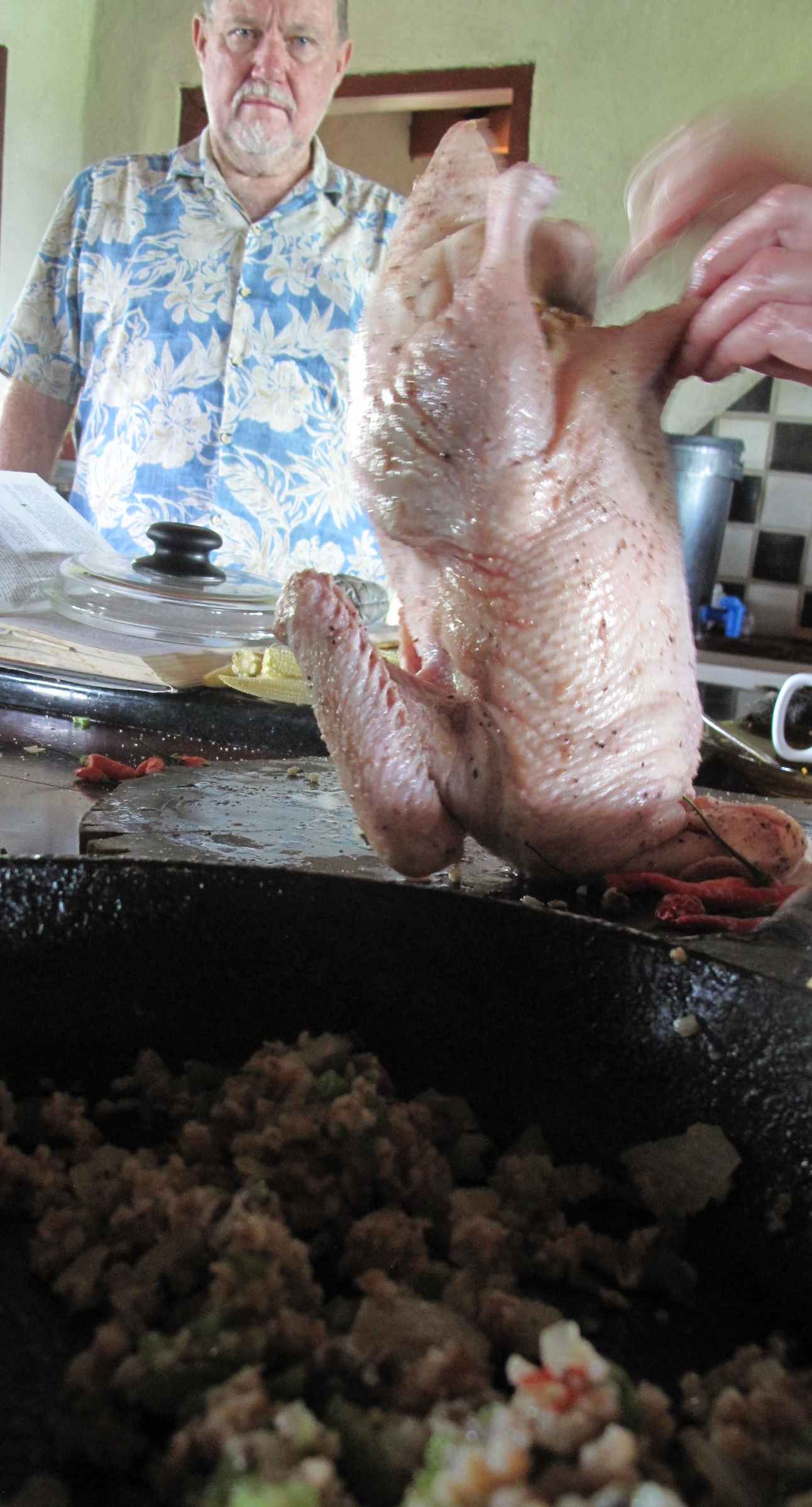 Lin stuffs the duck, and Clive carves instant little skewers out of matchsticks to secure the skin.