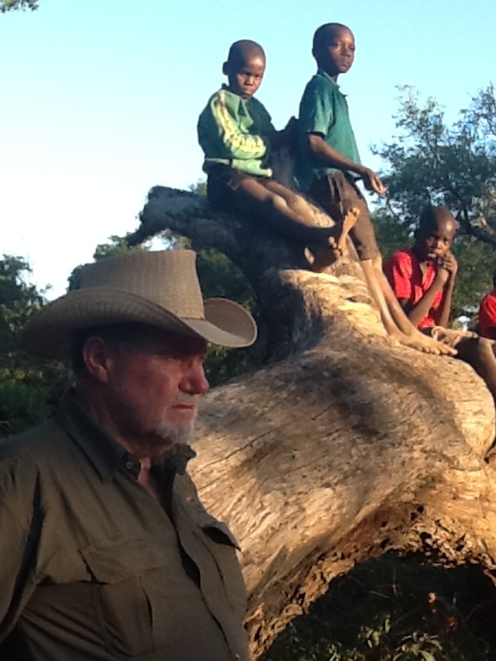Clive leans against a fallen tree, waiting for the action and flanked by “tree children”…