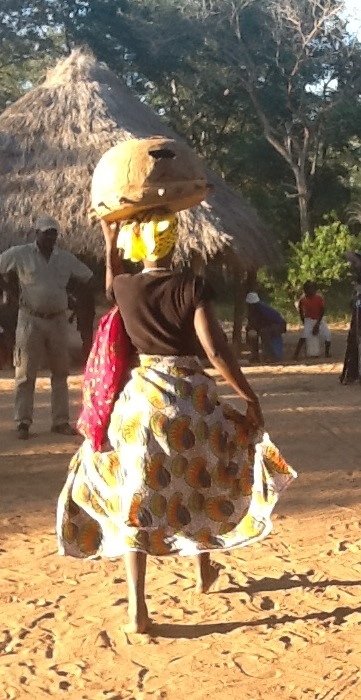 A brightly wrapped woman carries a drum on her head, heading for the dance area…
