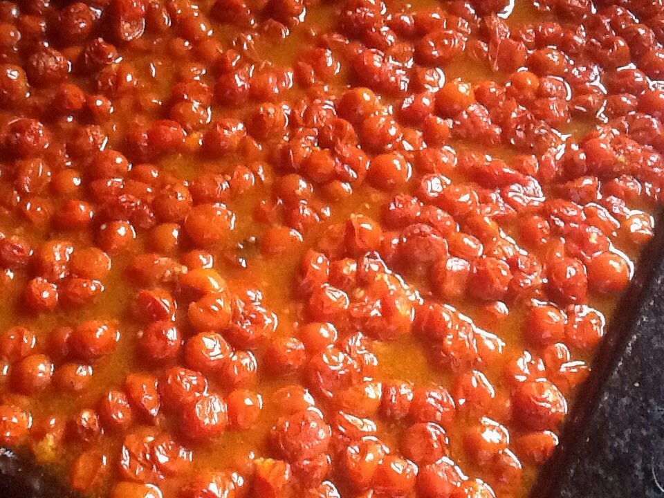 Roasted cherry tomatoes in the pan, slow cooked food at its tastiest, with Olive oil and a pinch of sugar….tomatoes home grown by my brother Steve and sister in law Clare…..