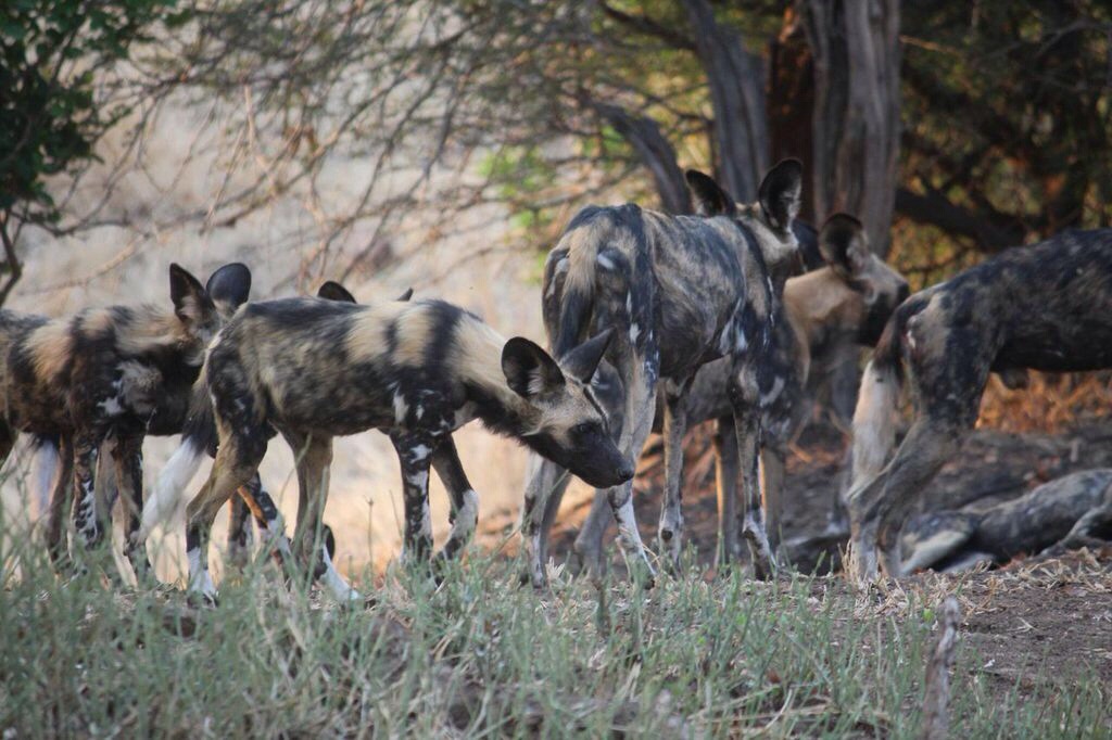 The glowing late afternoon light of Gonarezhou National Park echoes the gold in the dogs coats,