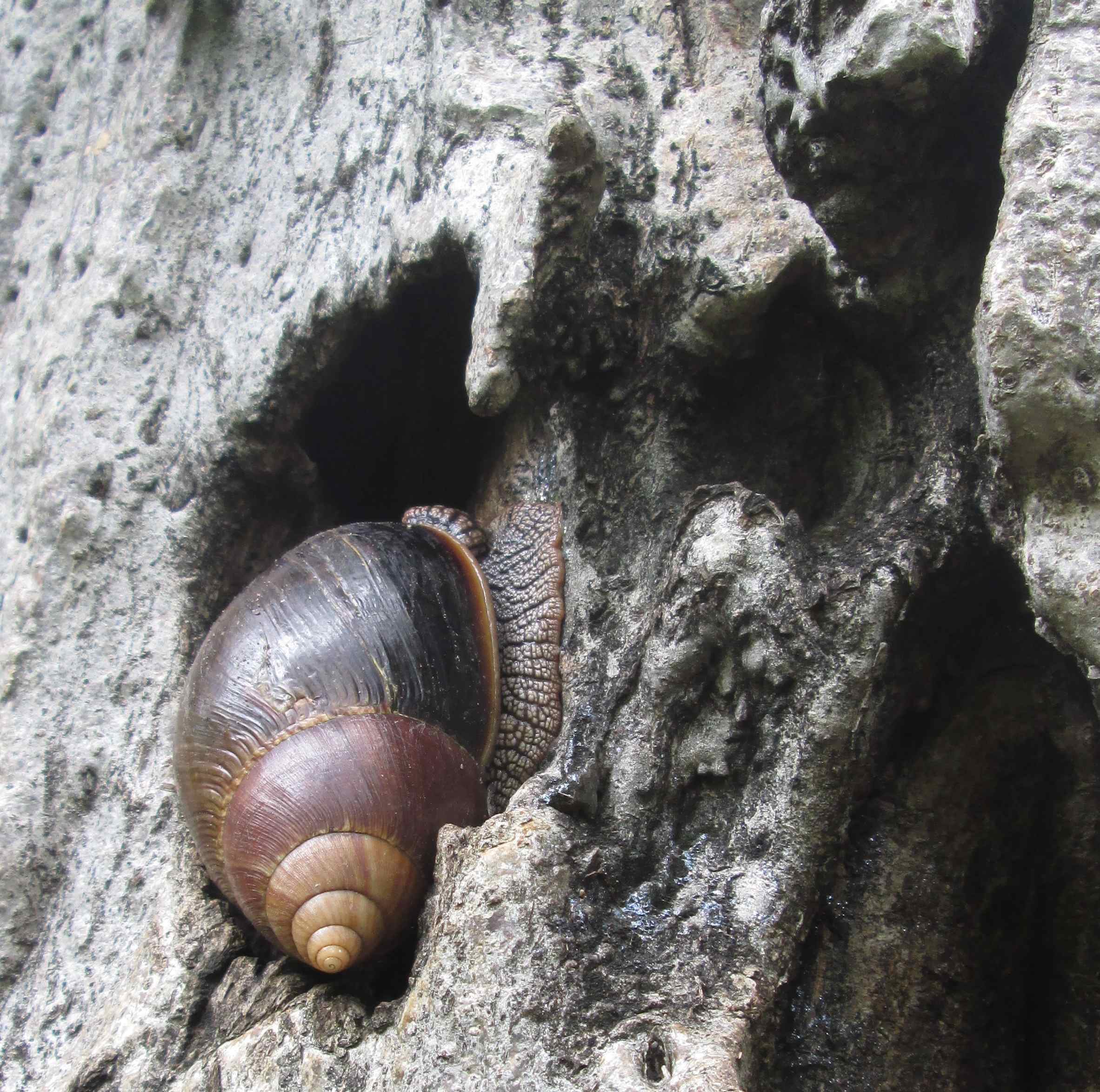 Passing a tree trunk, I am distracted by a tiny mollusc….