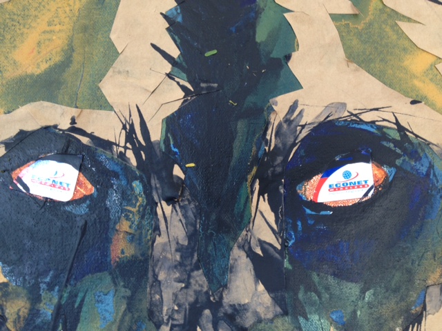 “Wild Dog Buddie” is a collage I am working on, incorporating used Econet Buddie cards, old brown paper and a red plastic cup picked up off the floor at a food court….