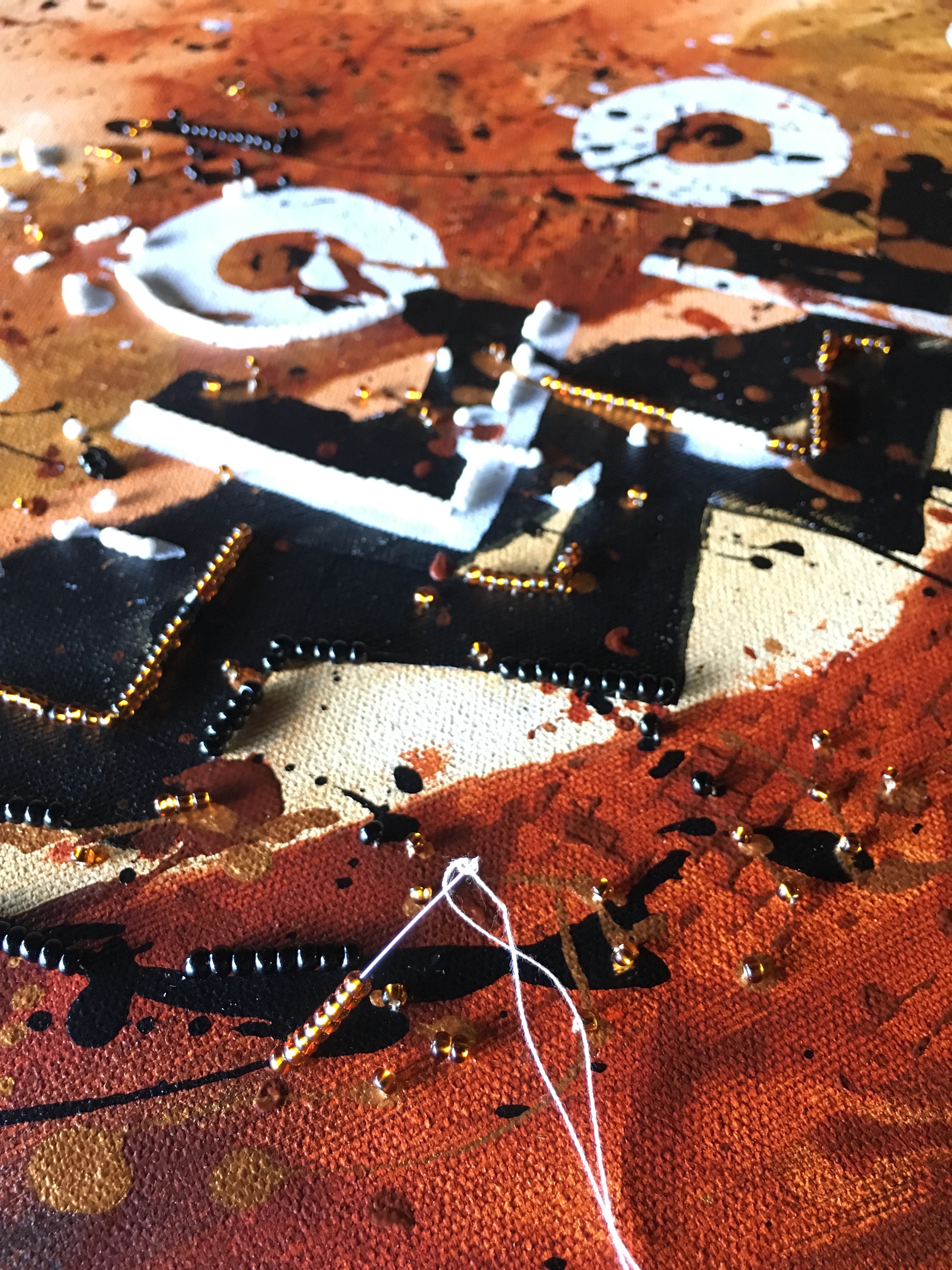 My artwork reflects the importance of cultural inheritance, skills and crafts which are traditionally “woman’s work“, such as hut painting and beading- it does not elevate these roles over modern progressive roles for women, but honours the cultural inheritance which in turn enables and empowers women to unleash creative energy, to think “outside their traditional space” and to splinter their traditional roles as housekeepers/carers into redesigning a new space. Bright endeavours cleverly build on traditional roles, using lessons learnt from experience to help women to compete and rise in the new world…