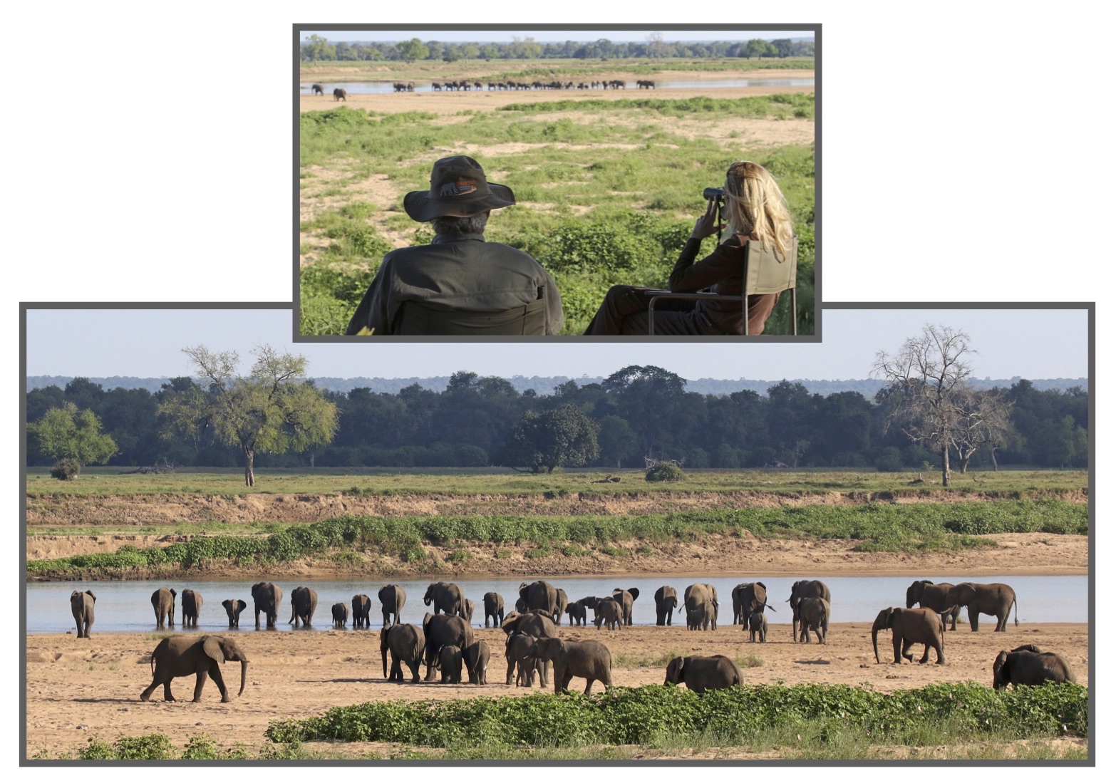 Safari chairs on the edge of wilderness await the happy guests….as endless elephant cow herds shepherd their babies to the Runde River to drink- here are two photographs from a previous trip, by fabulous Zimbabwean guide, story teller and photographer, Garth Thompson…