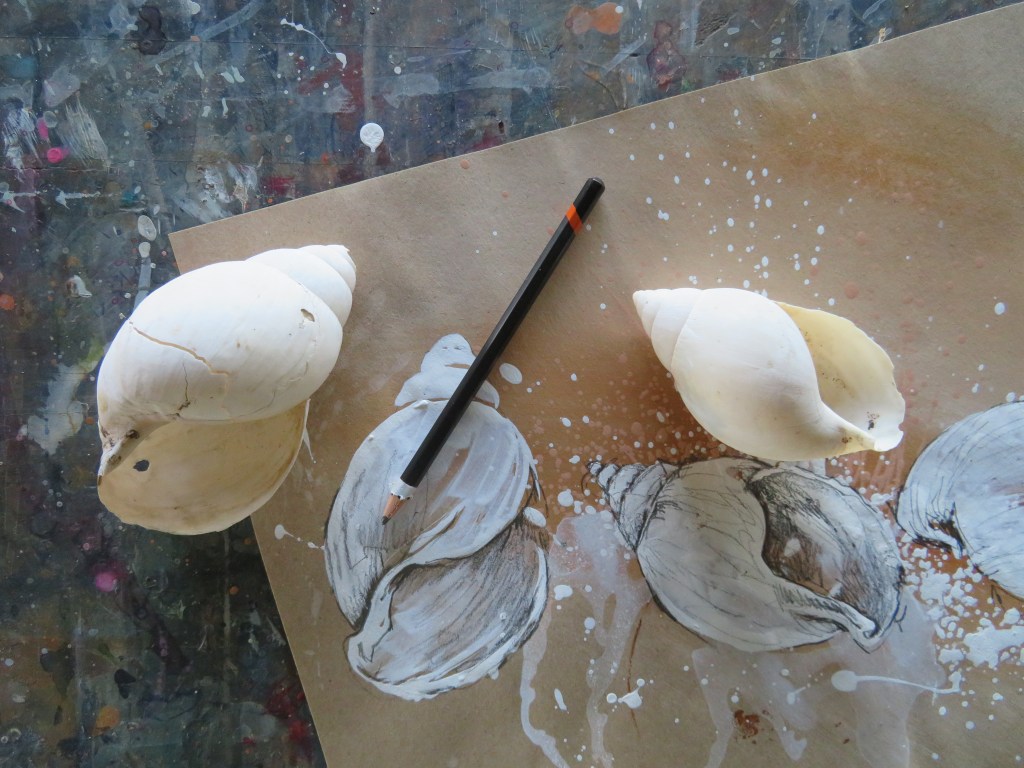 Giant land snails, often caught and killed by fire or drought, leave behind their exoskeletons… pristine empty white shells which are thereafter joyfully found by me like the jewels in the bush that they are. Prey to me and my pencil….!!