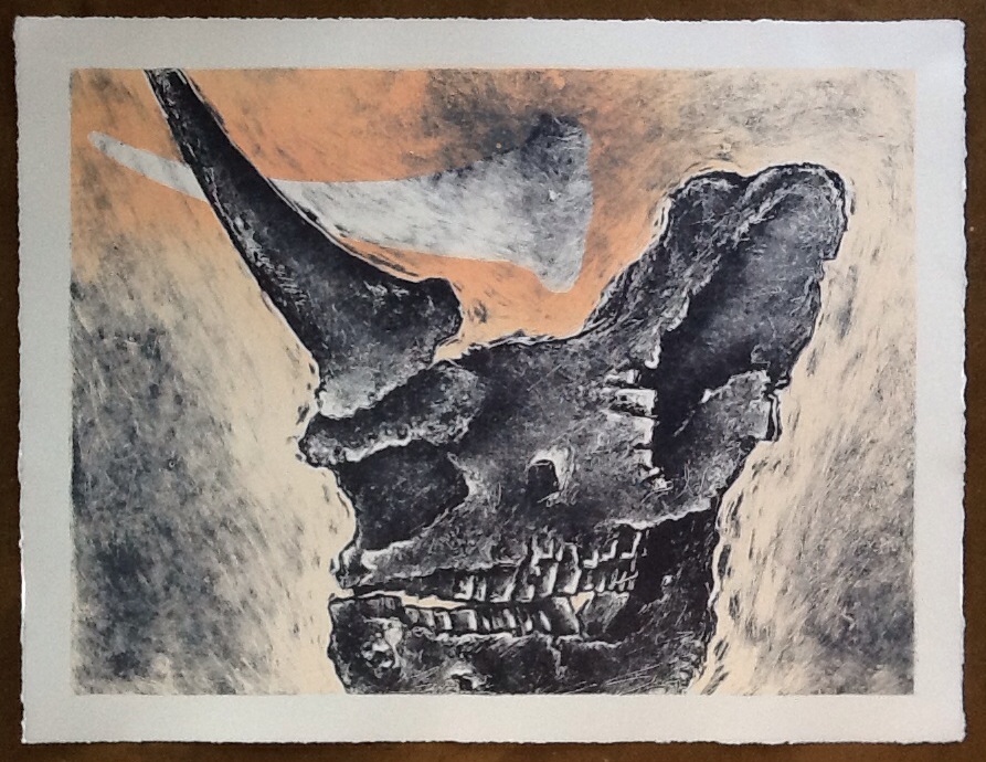 A mono-print..inspired by the old skull of a white rhino that I sketched many years ago, when do a mono-printmaking course at Artists Press in White River…