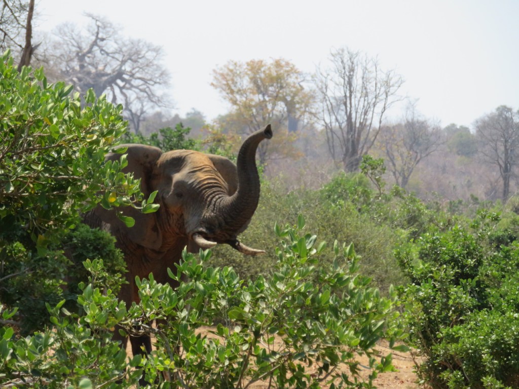 After we re-cross the Rundle River, on our way to the Save River, a young elephant suddenly blocks our road, scenting us with trunk held high and determined not to give way. Part of a much larger herd scattered over the road, this particular elephant on this particular day has undeniable attitude. Mr. Masango shivers, his memories kicking in …….