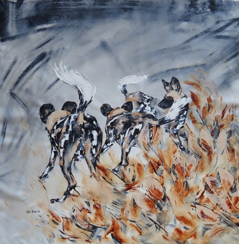 An ideal play ground for Painted wolves, aka African wild dogs to leap and wrestle before heading out to hunt with their family, as in my paintings below…