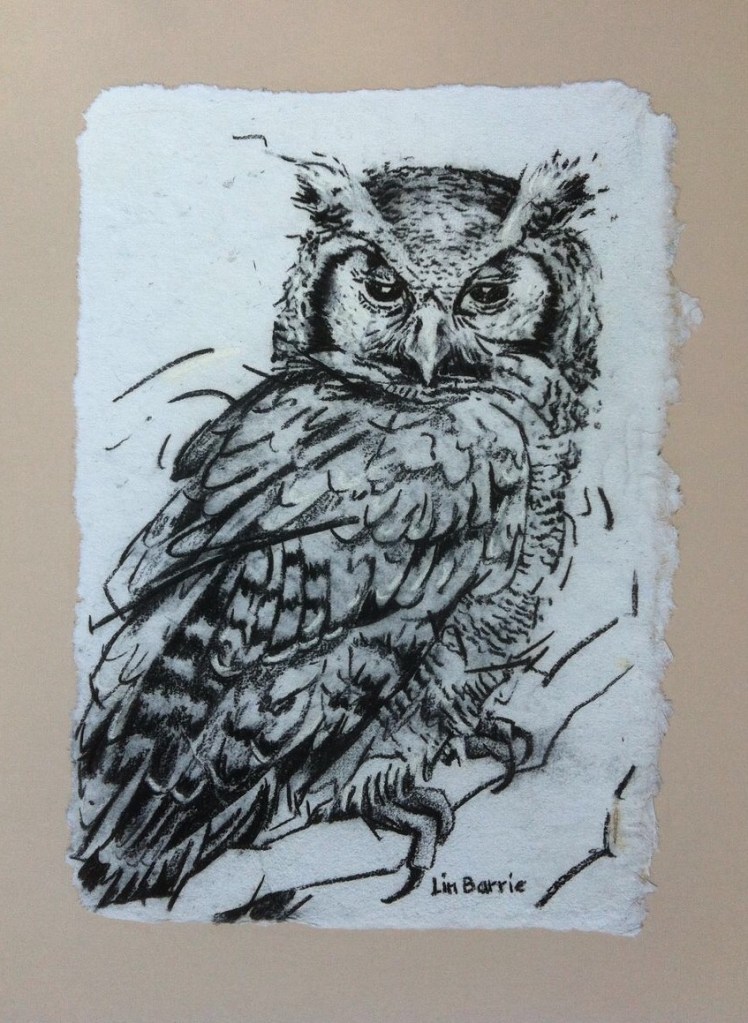 Giant eagle Owl, by lin barrie, charcoal on handmade paper