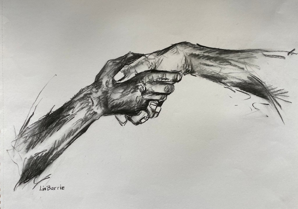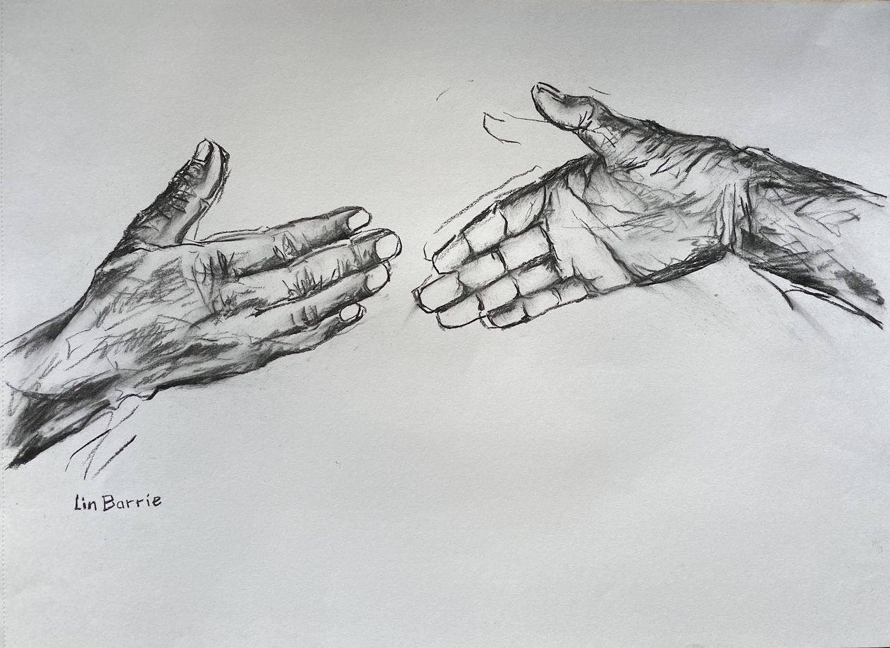 “Handshake”, by Lin Barrie, charcoal on white paper, A2 size