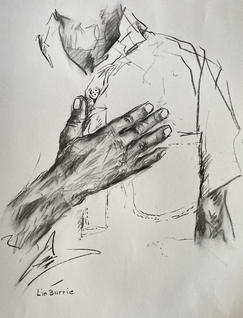“Hand on Heart” by Lin Barrie,  charcoal on white paper, A2 size