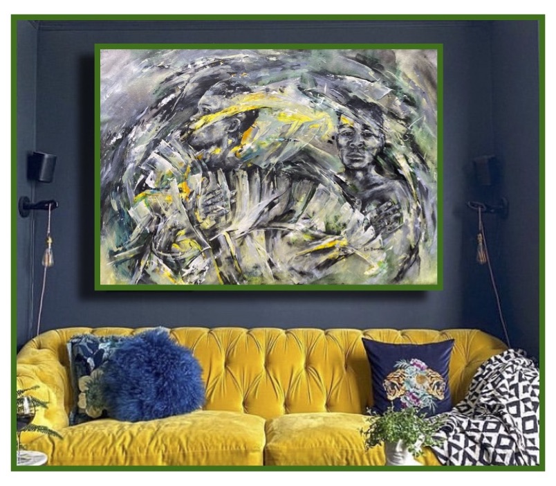 Here is my painting hung in a virtual room, with a gorgeous yellow life-affirming settee, which I chose because of the hopeful and positive colour!
