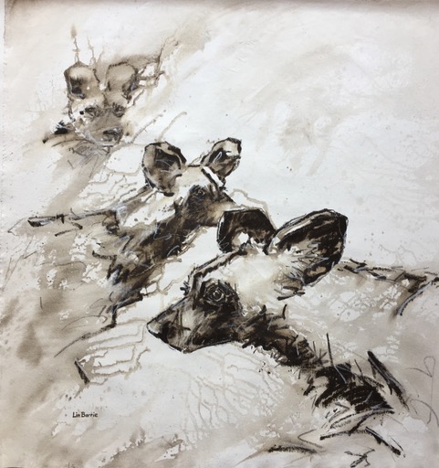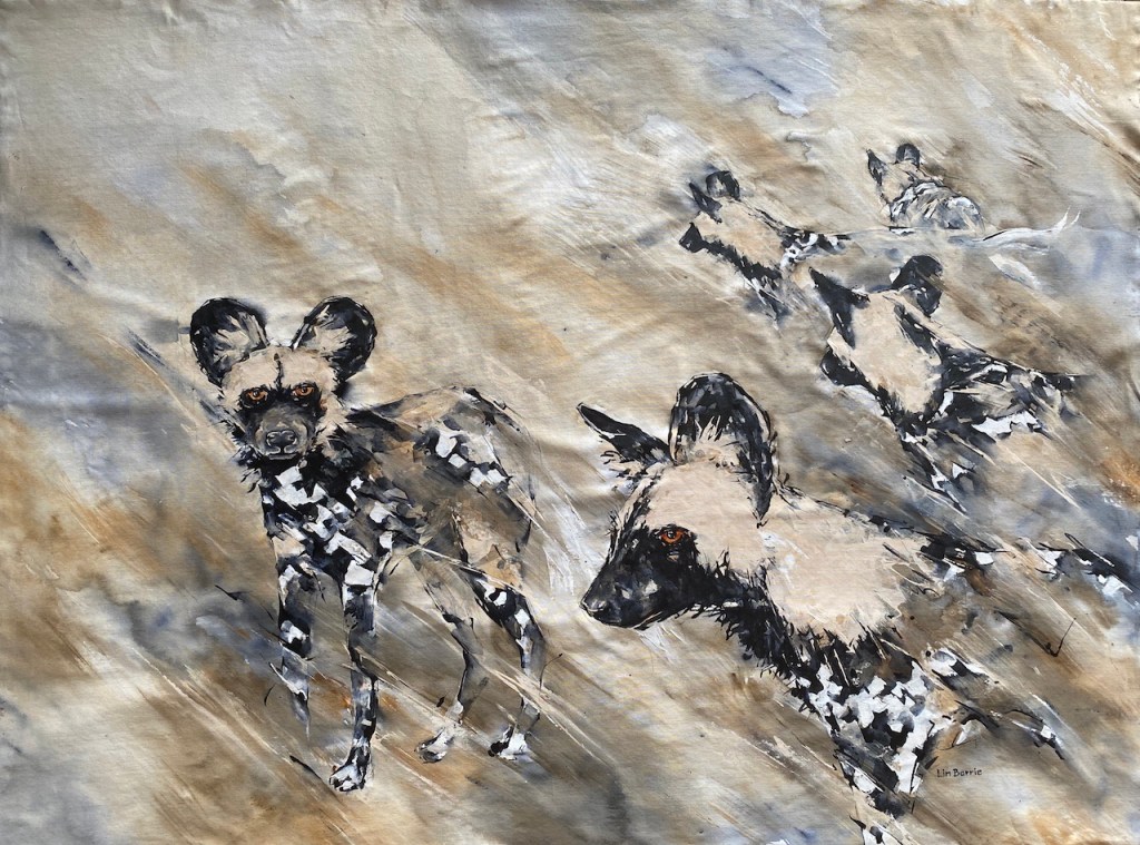 My photographs and field sketches embrace the warmth and social care that the African wild dog packs exhibit for each other..here is our Mbungo Pack, with the Alpha Male and Alpha female in the foreground…