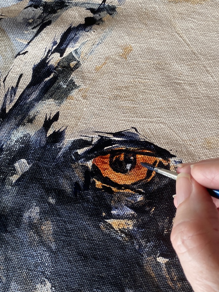 As I progress, using my field sketches to create a new large painting on canvas, the parts begin to make the whole…. a young dog stares out at me, red fire in her eyes, fierce yet wondering…