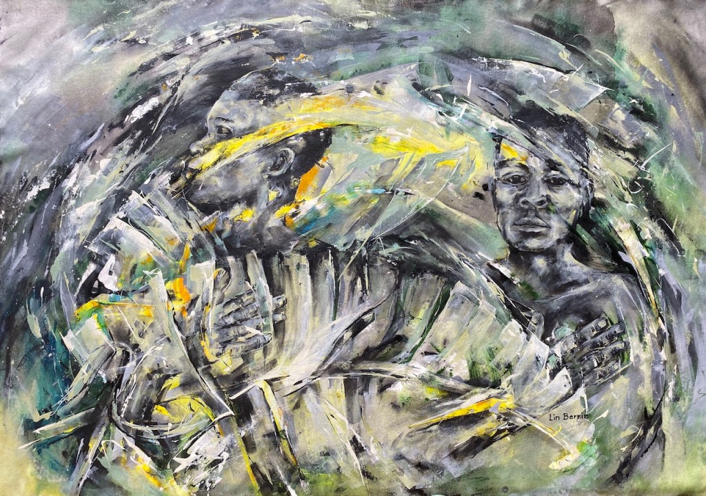 Lin Barrie, “Hands on Hearts”, acrylic painting on canvas, 90 x 128 cm