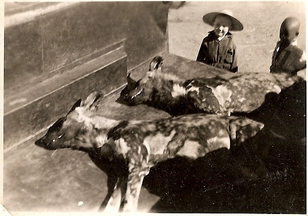 Endangered European and North American wolves and endangered African wild dogs (AKA Painted Wolves, Painted Dogs) resonate in my mind. They are charismatic social animals and apex predators in healthy ecosystems, hunters who, in the past and often in the present, have been persecuted by Man, considered as vermin with bounties paid for their tails…..as in this childhood photograph from Clive Stockil…
