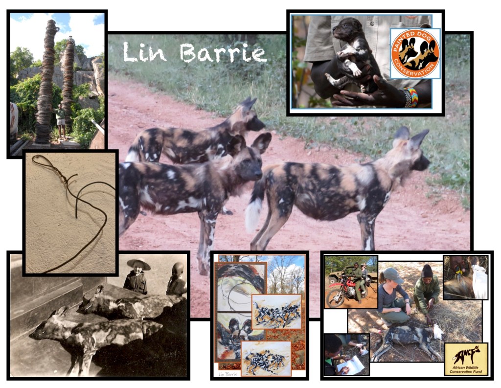 My photo collage below shows two tall flagpoles filled with some of the snare wires that we have collected in our area over the last ten years…. and some of the wild dogs killed in years past which had government bounties on their tails, considered as vermin in competition with domestic stocking and hunting. Through my photographs and my art, portraying the challenges of traps and snare wire for our wild dog packs such as the one below, (with our alpha female visibly pregnant), I collaborate with and support two committed Predator/Wild Dog research and outreach initiatives in the field, called African Wildlife Conservation Fund and Painted Dog Conservation. Hands on Conservation, monitoring of pack health and dens, and removal of wire snares plus community outreach, library and education programmes are ongoing.