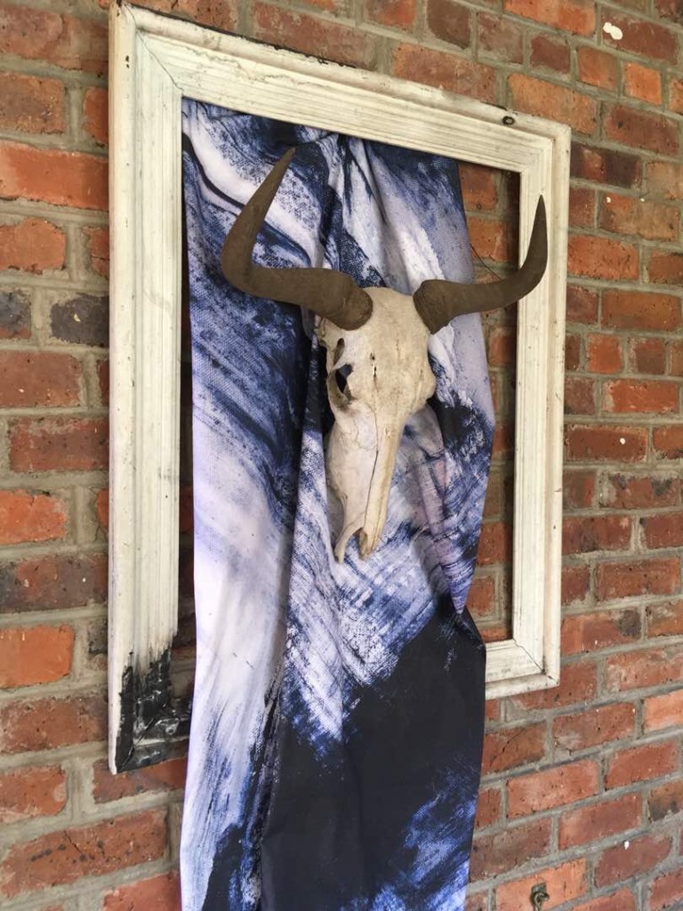 “The Burnt Picture”, art installation with Wildebeeste Skull, fabric print by Lin Barrie and burnt frame