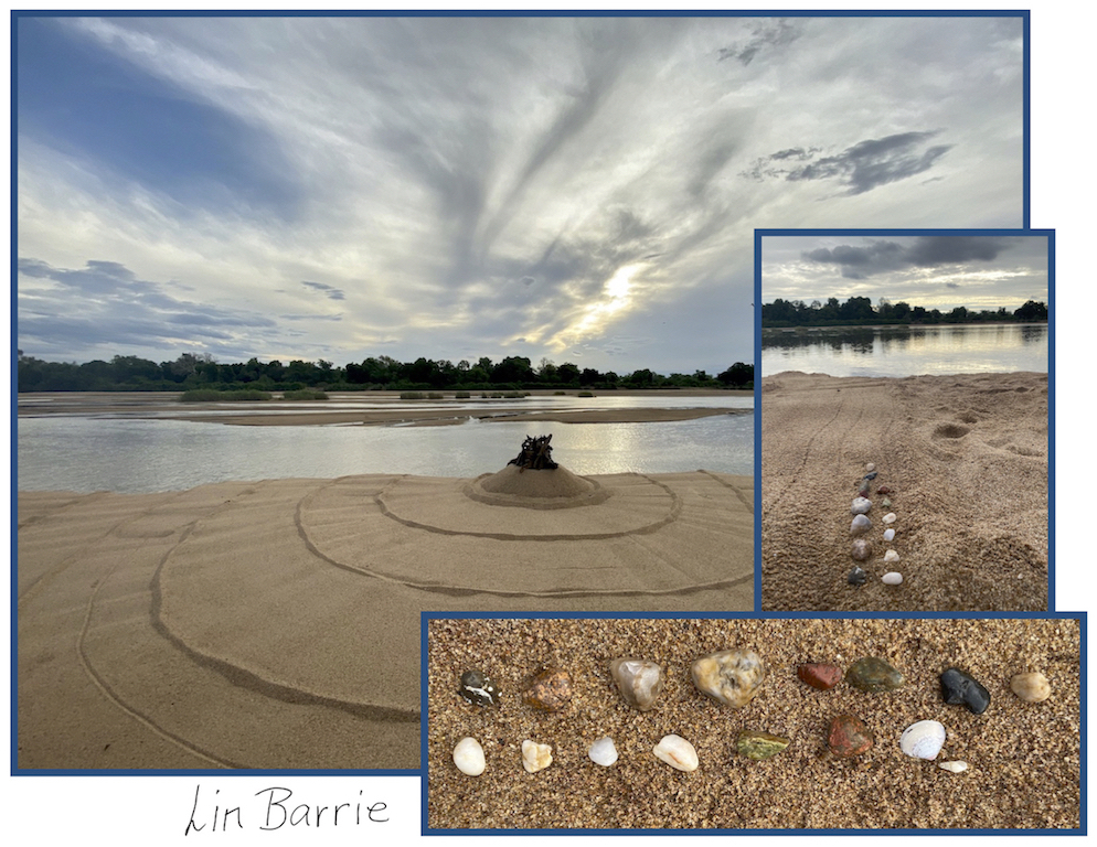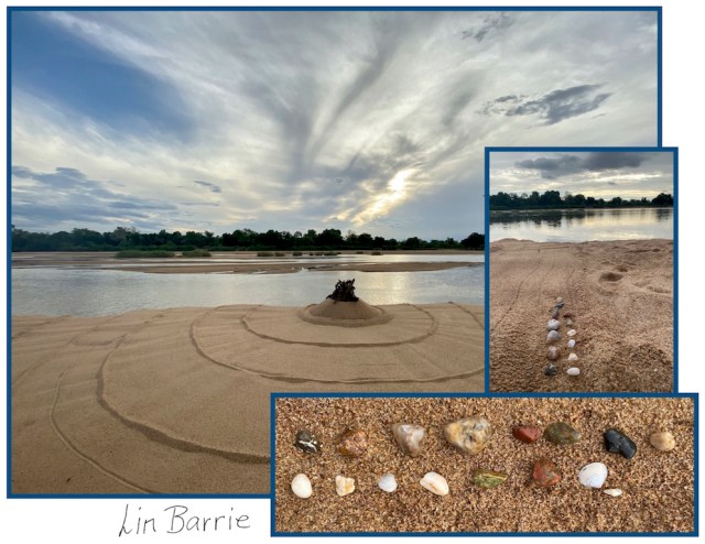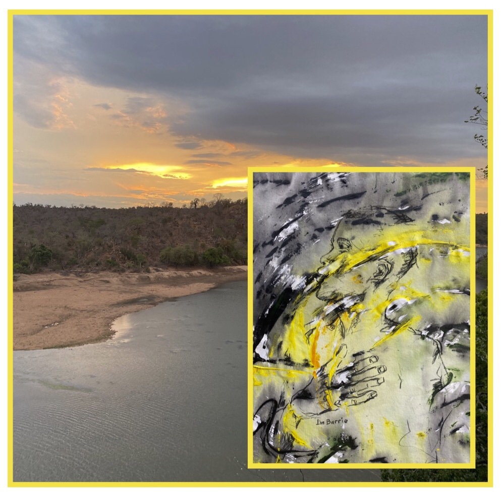 Art installations in landscapes are one of my passions, such as this sand sculpture on the banks of the Save River (Rio Save) which runs through Zimbabwe and through Mozambique all the way to the Indian Ocean, an ancient trade route for our Changana people and the Portuguese traders who sailed their ships along the coast of Africa. The installation, created by Chilo Gorge Safari Lodge for delighted guests at sundown, is enhanced with found objects, stones, by my grandchildren…..