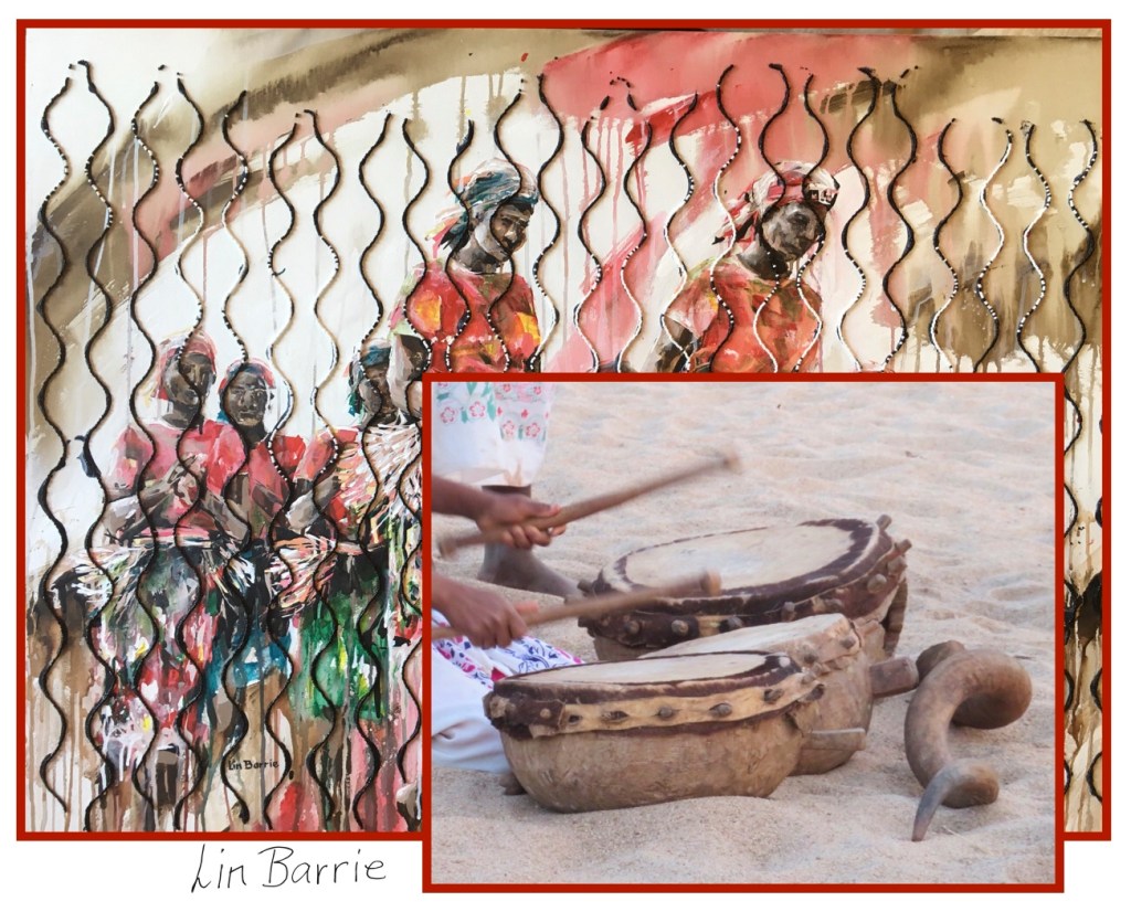 Culture and dance, tradition and stories, fascinate me.. … my painting is acrylic and beadwork on canvas, and my photograph is of our local hide and wood drums and the traditional Changana kudu Horn trumpet.