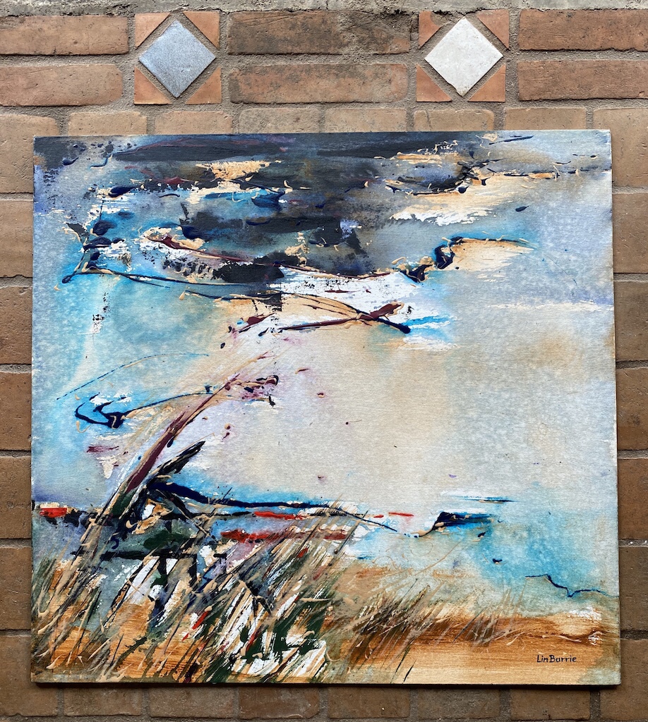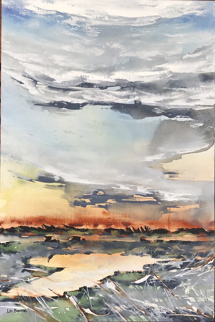 A universal landscape, this abstract painting could also easily be reminiscent of the coast at Tavira or on the Rio Formosa in Portugal, or, indeed, a turbulent sky in Scotland.