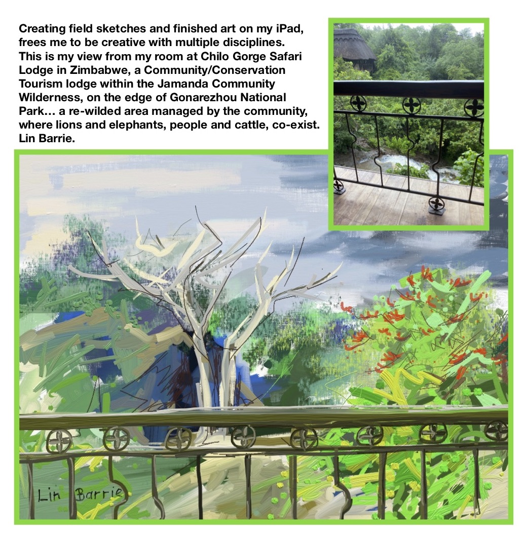 Living in the Lowveld of Zimbabwe, on the edge of Gonarezhou National Park, (Chilo Gorge Safari Lodge) and also in the Save Valley Conservancy, I sketch and paint constantly. Surrounded by local communities, lifestyles, cattle, goats and wildlife, daily I watch people interacting with such as African wild dogs, elephants and lions..