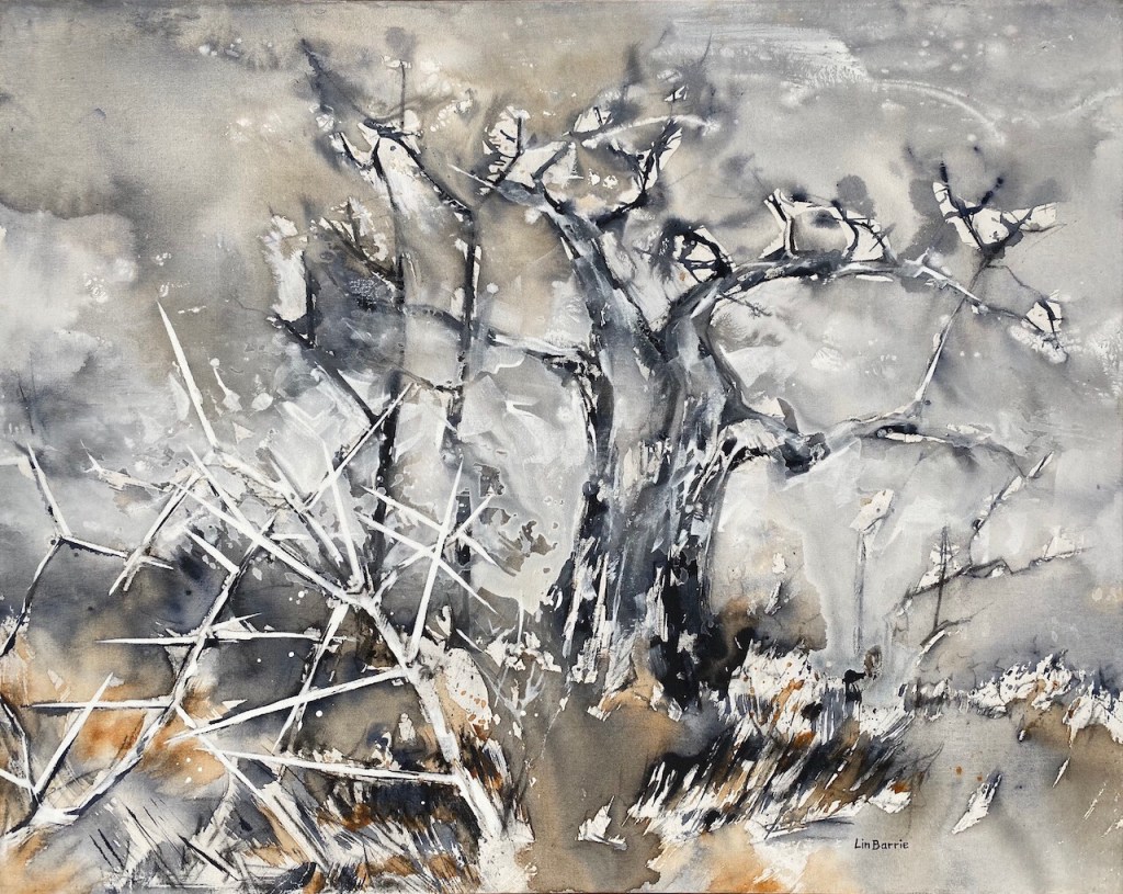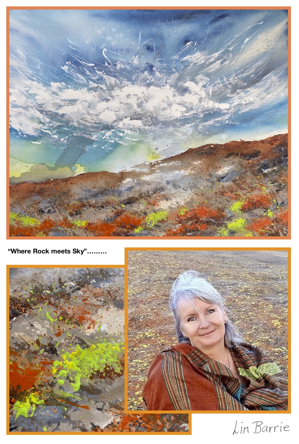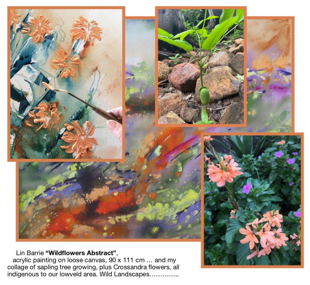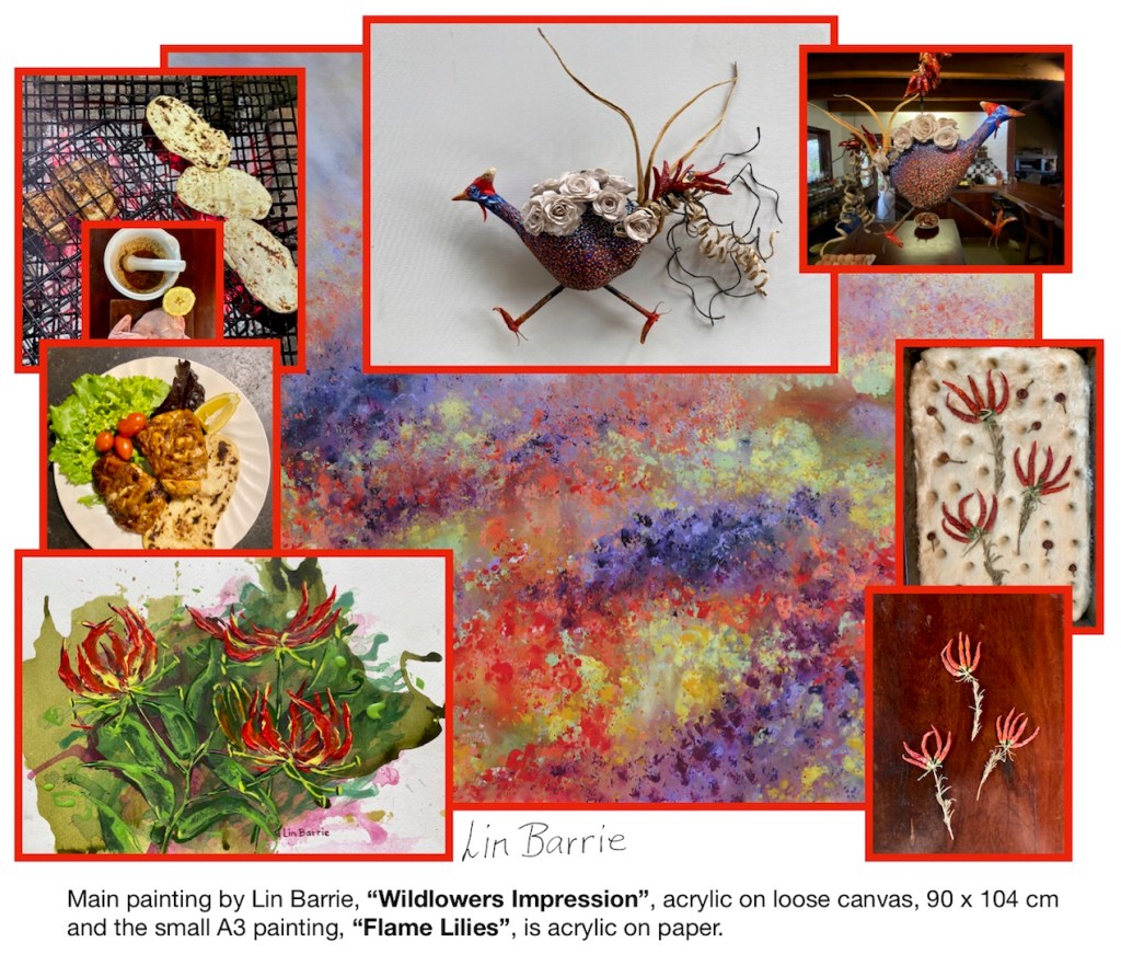 Main painting by Lin Barrie, “Wildlowers Impression”, acrylic on loose canvas, 90 x 104 cm and the small A3 painting, “Flame Lilies”, is acrylic on paper.