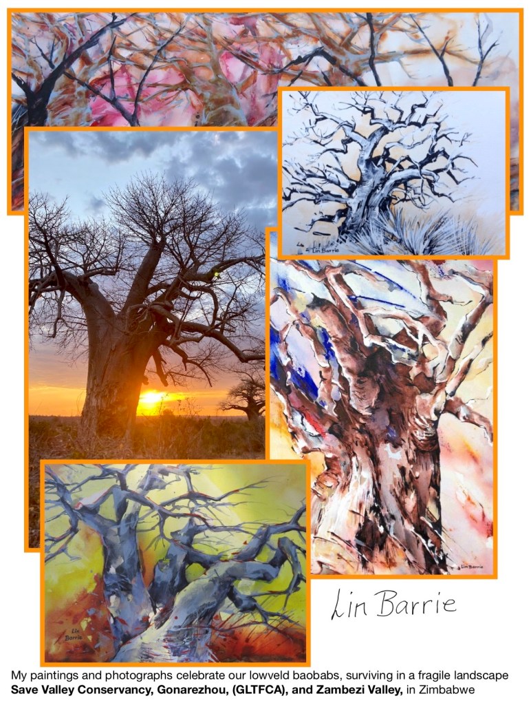 My paintings and photographs celebrate our lowveld baobabs, surviving in a fragile landscape, Save Valley Conservancy, Gonarezhou, (GLTFCA), and Zambezi Valley, in Zimbabwe