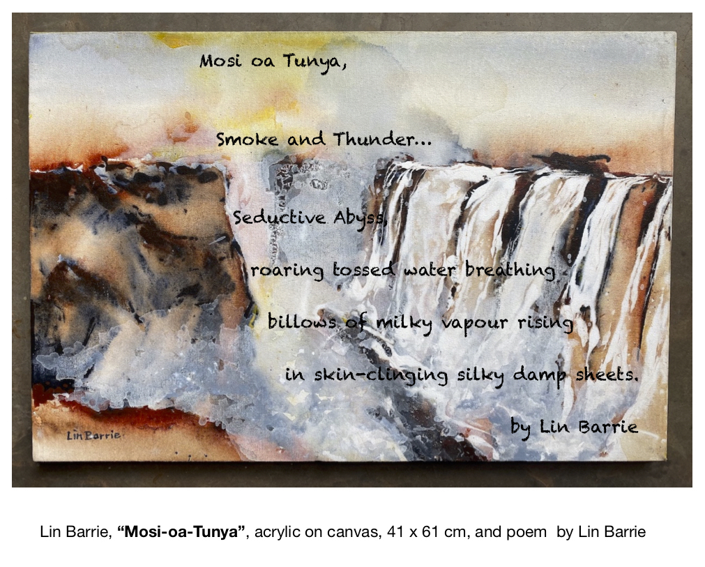 Poetry, my own or in collaboration, inspires me, and I worked with Tsoko Gallery (Marcey Mushore) and the British Embassy in Harare, to record my feelings towards a poem by a local Zimbabwean Poet, Taruwona. Dealing with the inner endangered landscape of human emotions and gender-based violence, my response was two large art canvases, landscapes titled “Fire” and “Water”…..