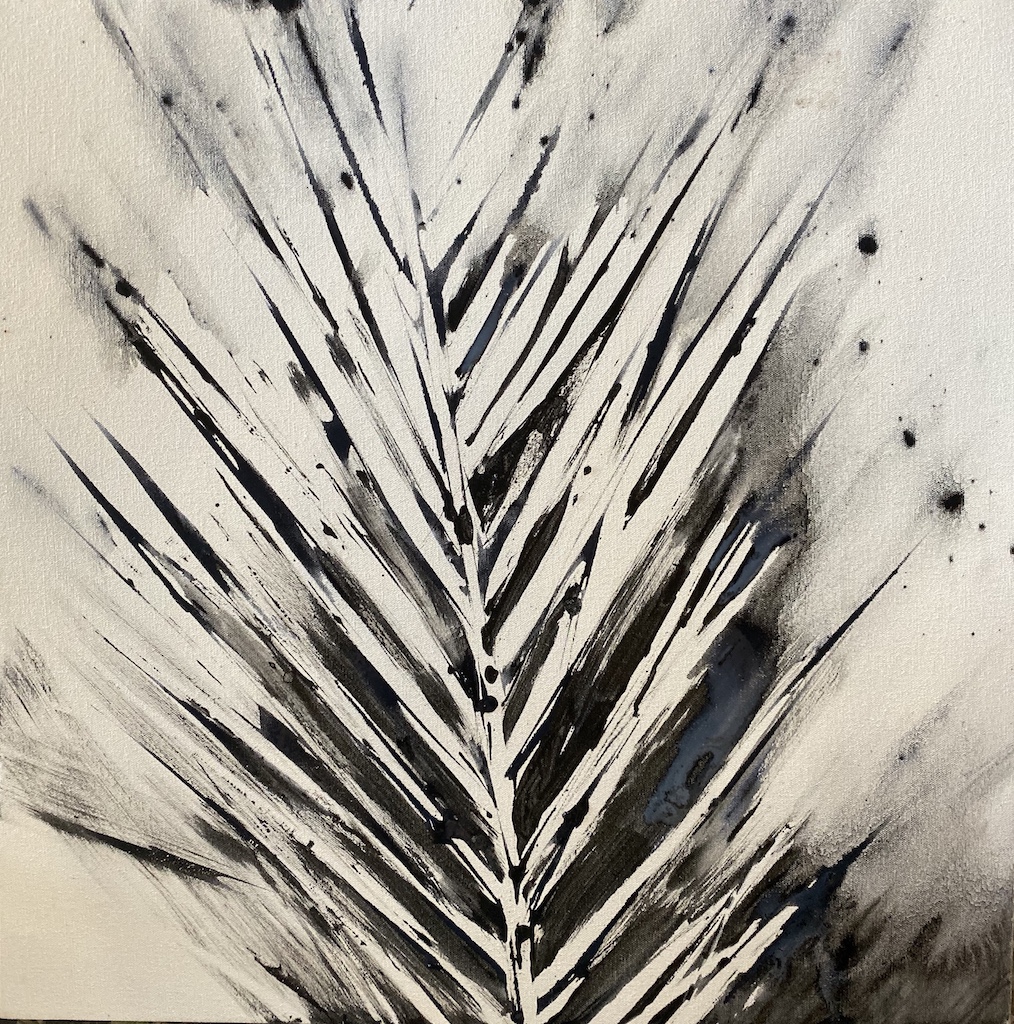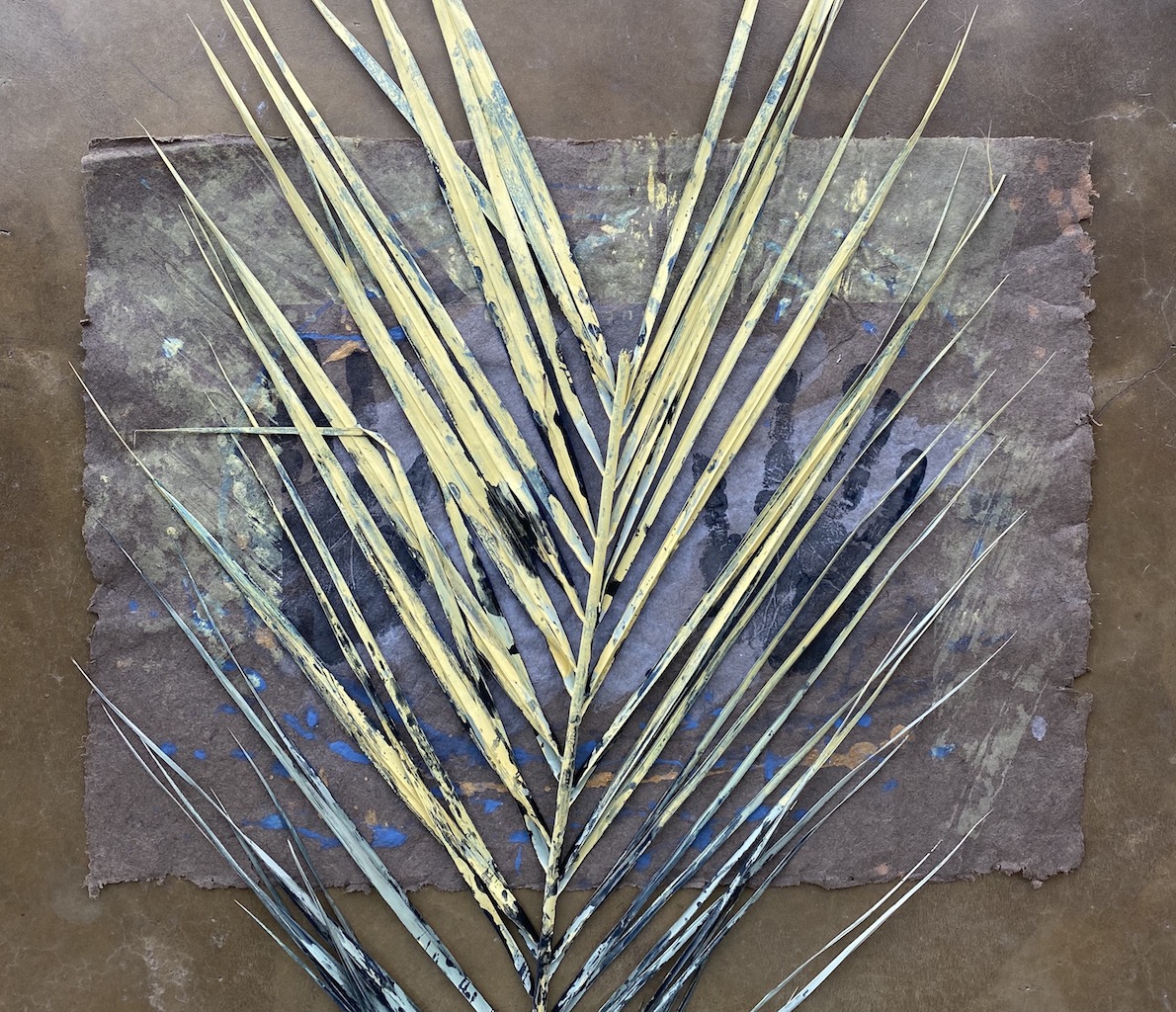 Monoprint is a form of art practice that I use to celebrate plant life and landscape, printing directly from plant leaves, from my hands, and from other found objects onto canvas or handmade paper to create art statements – such as this Monoprint from an indigenous Phoenix reclinata palm frond….