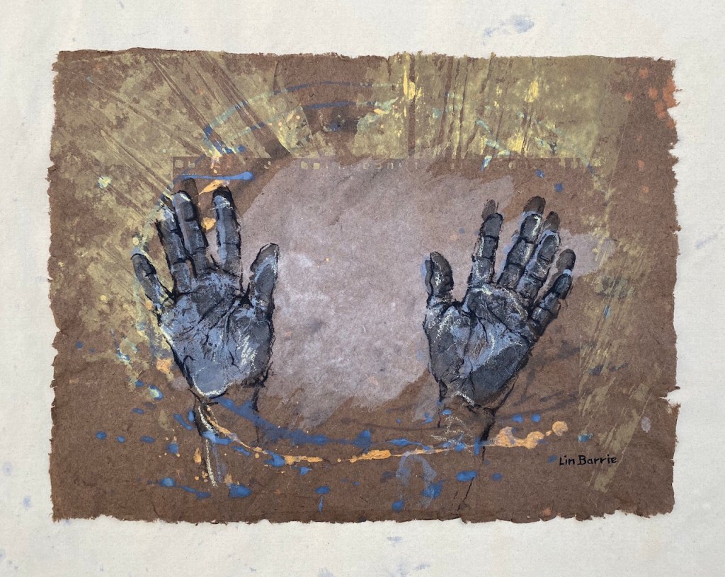 “Nothing to Hide”, below, is my finished artwork, mixed media on handmade paper – a comment on our ‘hand print’ on endangered landscape, our ability to change landscape for better, or for worse…our choice!!!!
