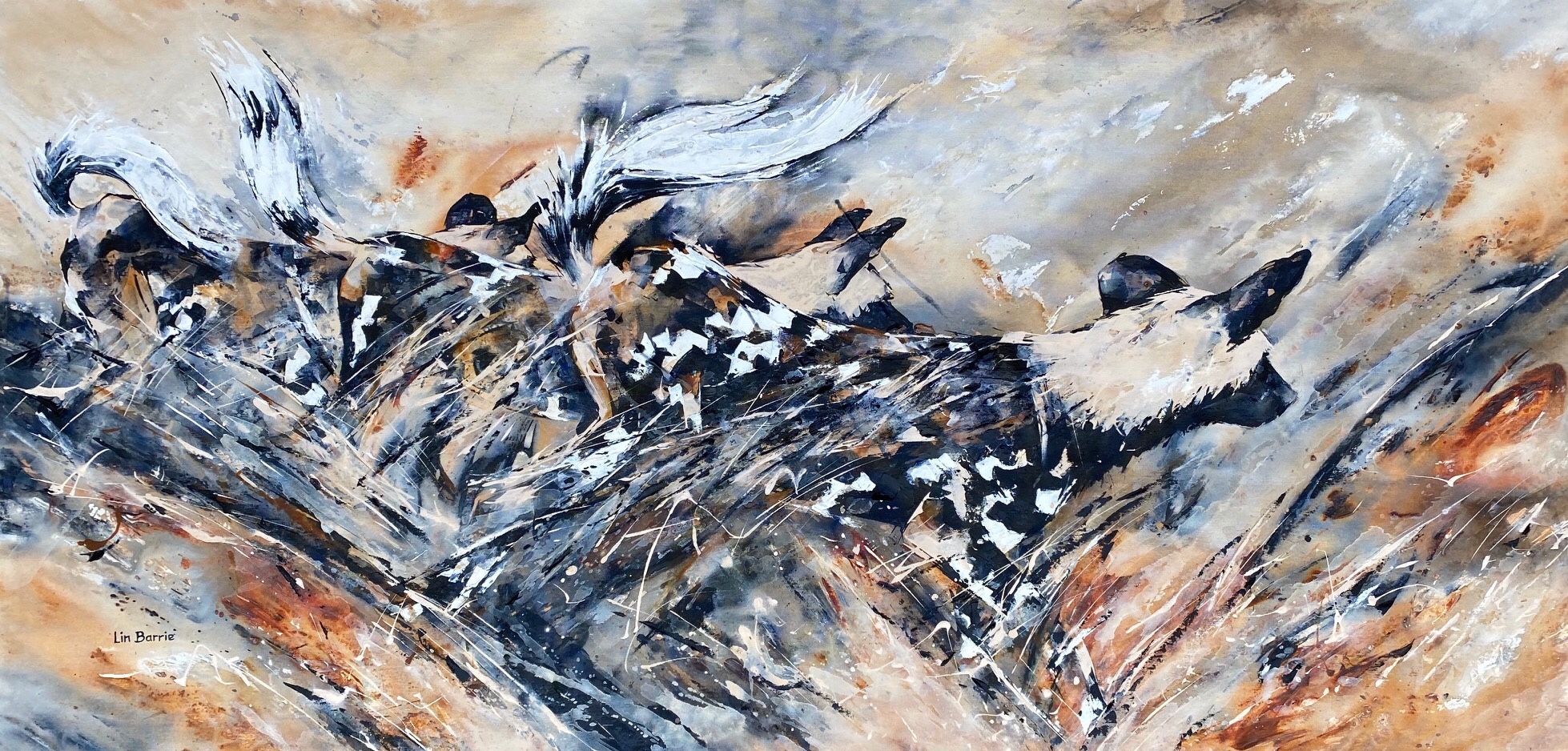 Here is one of my many action paintings of a pack in full hunt… “The Chase”, acrylic on loose canvas, 88 x 180 cm..