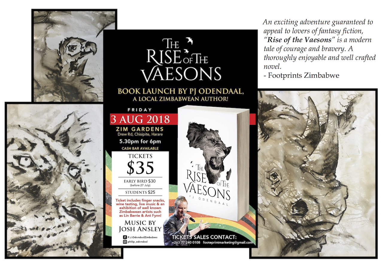 Here are a few of my sketches for a book launch/ music/art event held in Harare. This book is an Ecological Fantasy – a modern myth (set in a futuristic endangered African landscape), called “Rise of the Vaesons”, written by Zimbabwean author P.J.Odendaal….