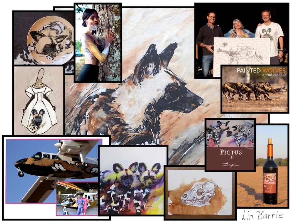 My approach in my art is multi disciplinary, often 3 dimensional, and collaborative. In pursuit of my art and in raising awareness of African Wild Dogs and endangered landscapes, I sketch landscapes, wild dogs, skulls, and footprints. I have followed in the steps of Picasso and painted ceramics! I have painted a “Wild Dog” tourism aeroplane in collaboration with a master spray painter; I have collaborated with my make-up artist daughter to create wild dog body paint for a conservation dinner/fundraising; I have donated artwork to a seminal coffee table book on “Painted Wolves” which benefits Painted Wolf Foundation; I have created a “Painted Wolf “ fashion outfit with Spanish designer Manuel Fernandes; and my wild dog paintings are used on Painted Wolf Wines labels, a great wine making initiative which directly benefits wild dog conservation, and with Wine and Wild Dog tourism weekends held yearly at Chilo Gorge Safari Lodge. Wine and wild dogs go together!