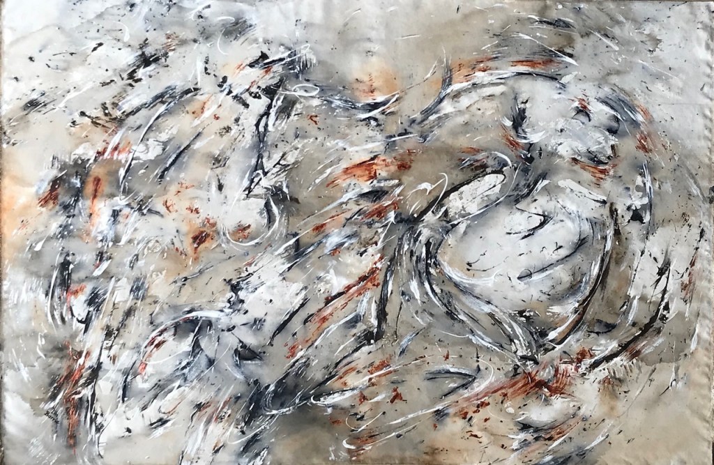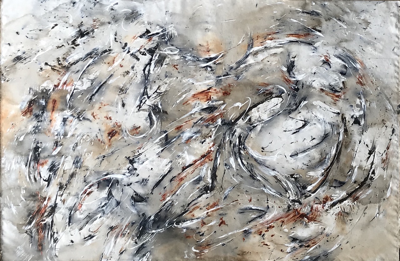 Using my favourite painting tool, an old palette knife inherited from my father, I inscribed abstract images in acrylic onto canvas. Empowered by my own father’s fair and unconditional love during my childhood and adult years, I felt strong…. Inspired by the history of Chinese brushstroke painting, poetry and calligraphy, I painted….