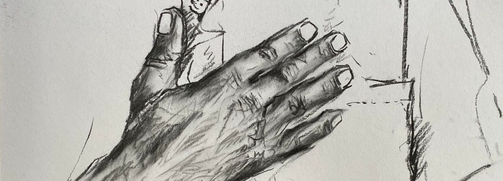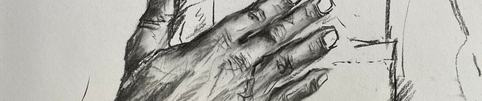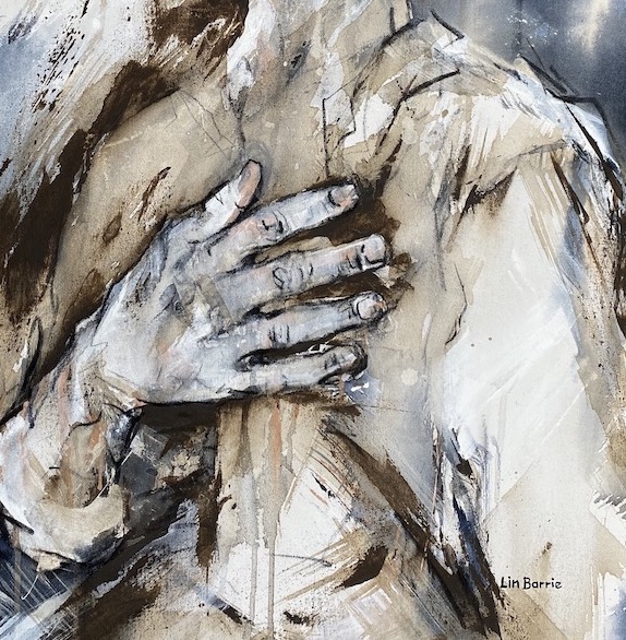 Lin Barrie, charcoal sketch detail, showing a Hand on Heart gesture…respect, care for those around us, a universal symbol of love…