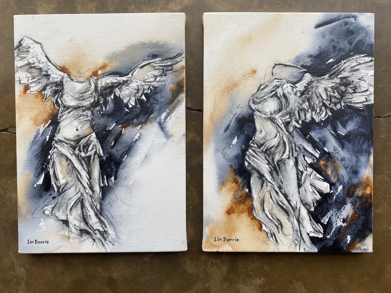 Winged Victory, Nike I, and II, are acrylic and charcoal on stretched canvas, each 42 x 30 cm (A3)