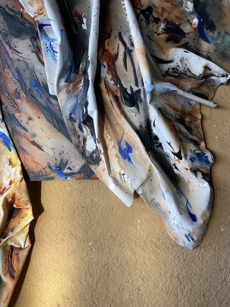 I have draped a large canvas, reminiscent of what I see when I stare into fire, into flames, whereupon I take flight or contemplate fight……..