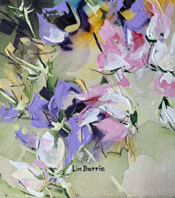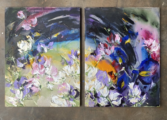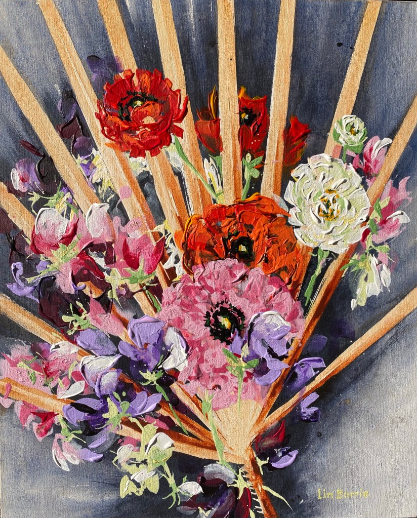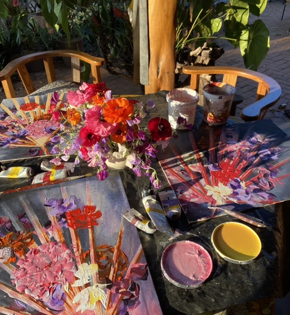 One of my “Palm Bouquet” paintings … palm frond, ranunculus and sweet peas, acrylic on canvas board, each one is 51 x 41 cm
