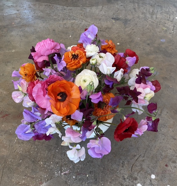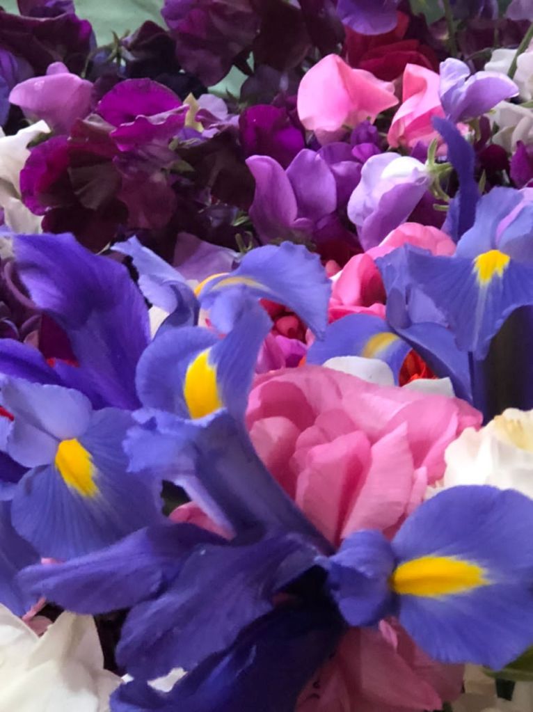The bunches of sweet peas and ranunculus I am gifted from Steph, grown by Di of Huku Mombe – look at those irises!