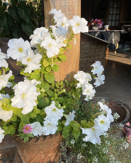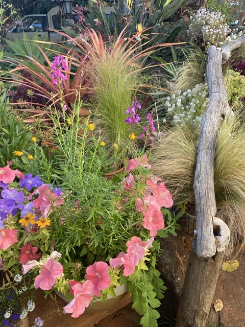 Plantings of annuals in pots enabled dad to selectively water according to need with his watering can, saving wastage- always waterwise was Dad!