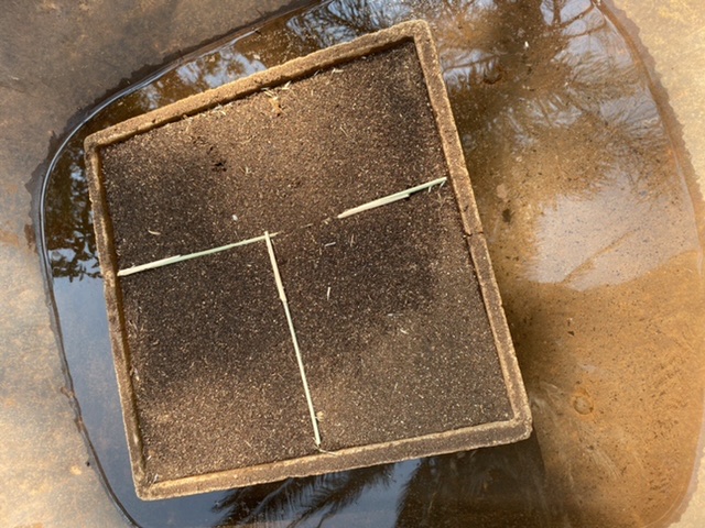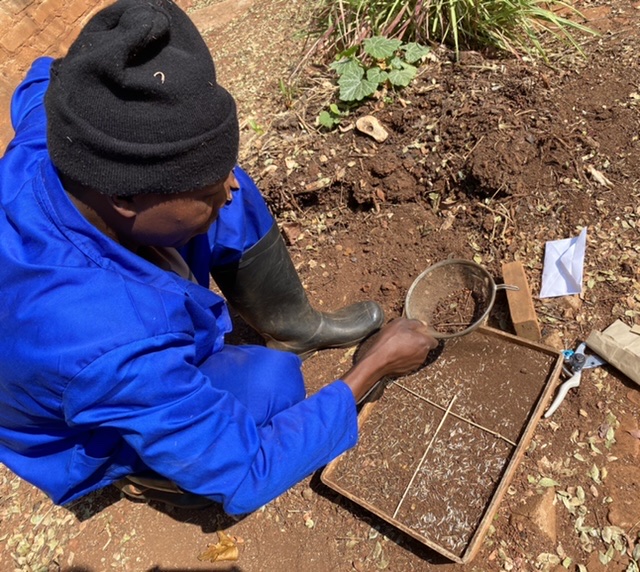 Biggie has become the ‘constant gardener’ and sieves fine homemade compost gently over the three types of zinnia seeds we have just scattered…