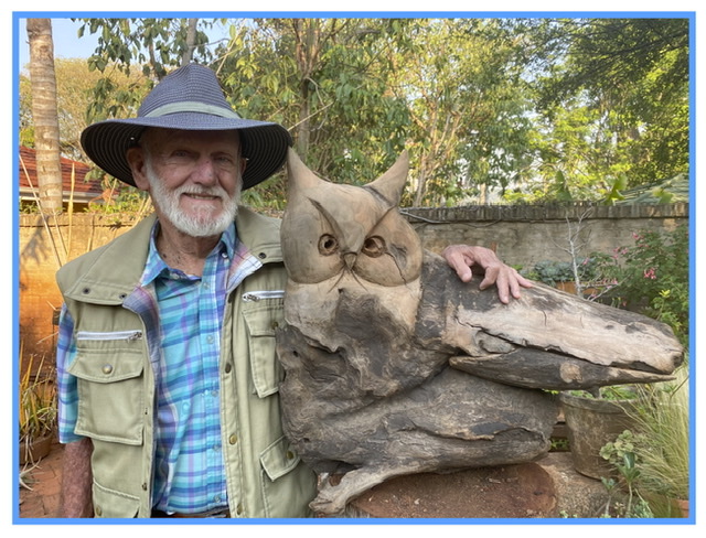 Dad and the wooden owl sculpture in our garden – the sculptors of this magnificent bird are the talented Zimbabwean Zata brothers