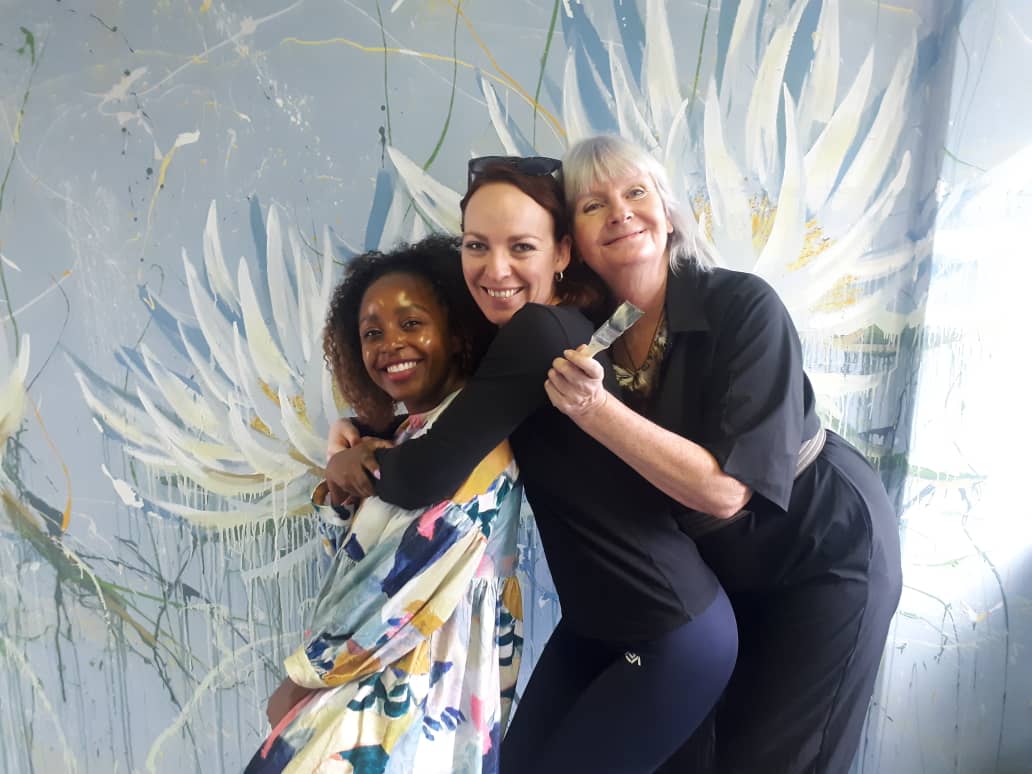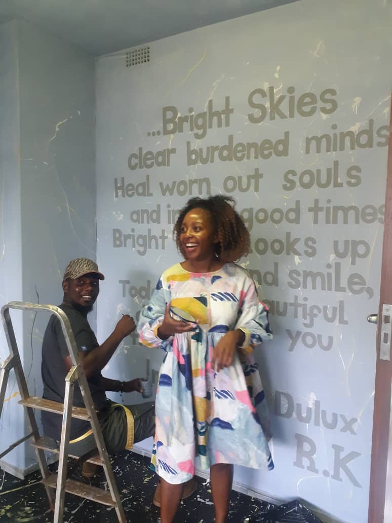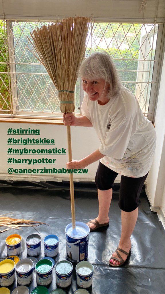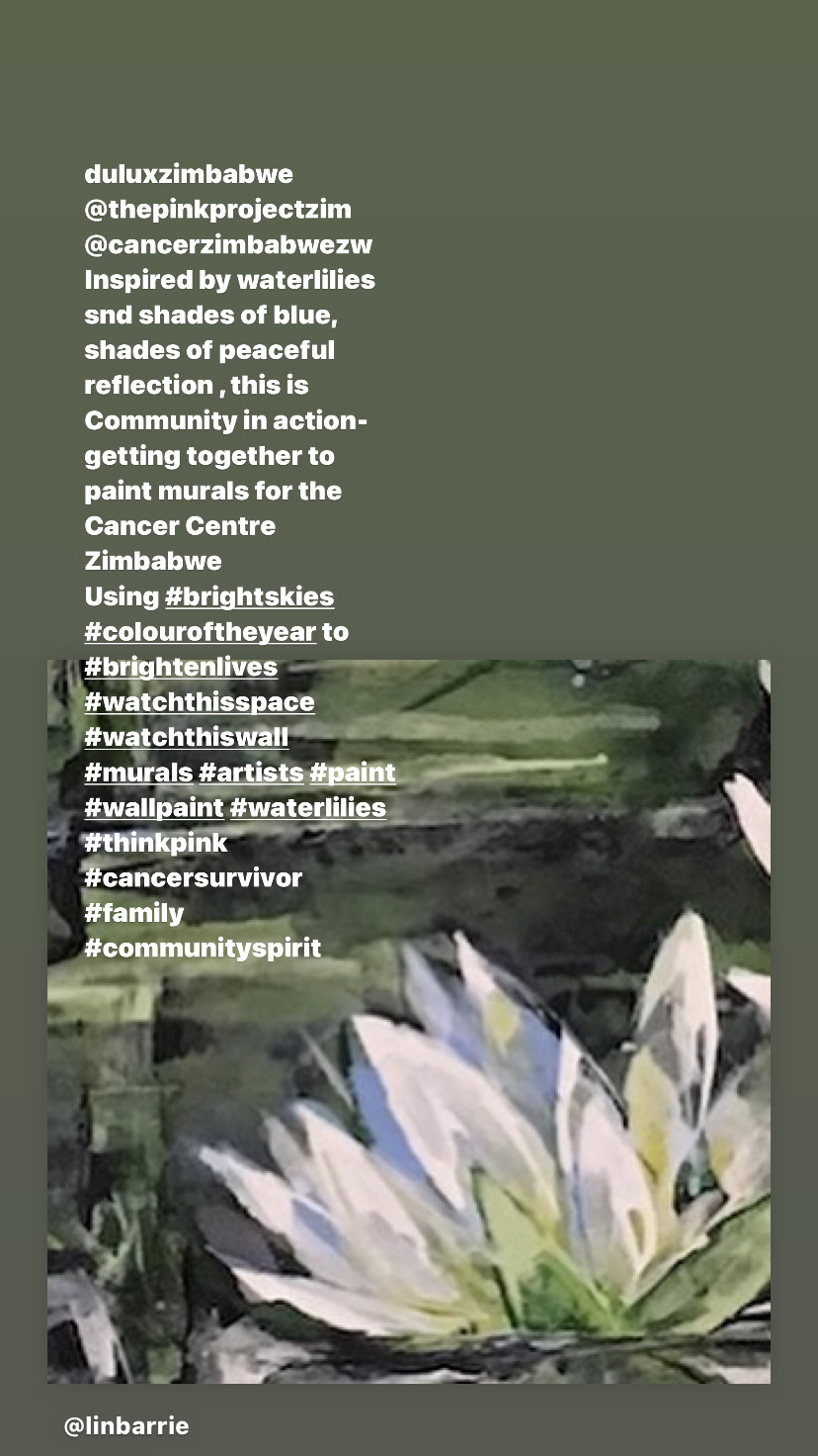….a large and growing group of artists and cancer survivors are working with Debi Jeans of The Pink Project, and Sophie Banks, Interior designer, to paint the walls of the Cancer Association Centre in Harare… ably helped by Junior and Linda of the cancer centre.