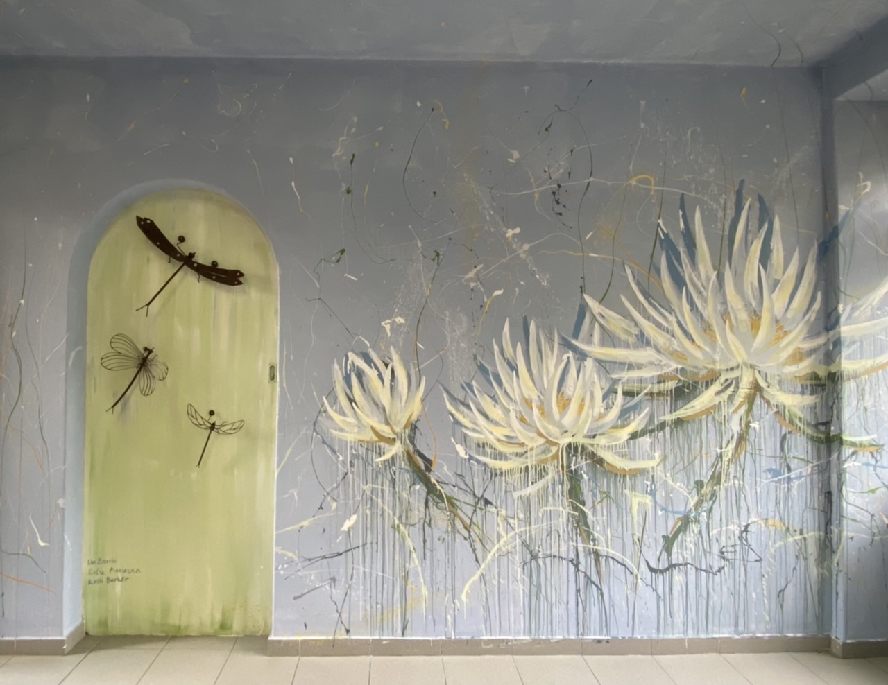 Here below is a mood board, to give you a feeling of what Debi, Sophie, Kelli, Ru and I have discussed for the massage room….water, waterlilies and dragonflies. And deeply inspired by Dulux’s “Bright Skies” – a calm and reflective colour of the year, for us to dream into. Thank you, Dulux Zimbabwe, for donating paints and Electrosales for donating the hardware to paint with!