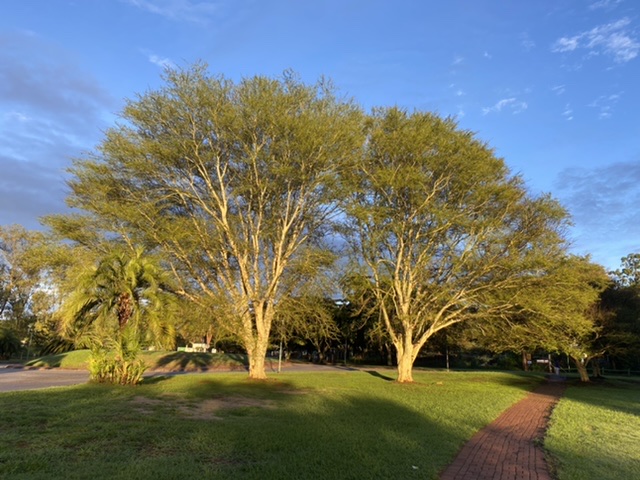 From the sun side of these very same trees, (at the entrance to the Brooke Estate), these glowing golden beauties are framed by a summer sky..