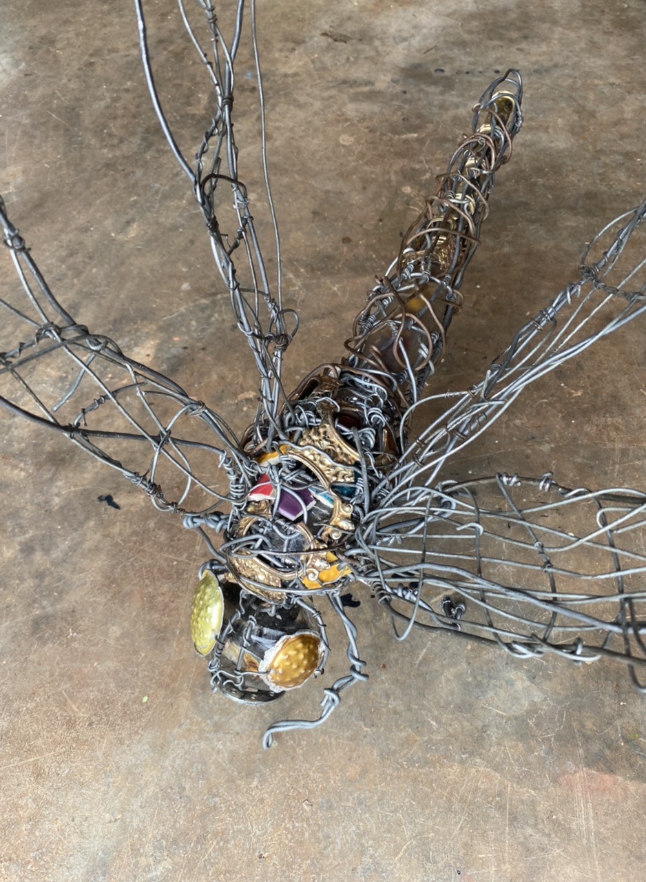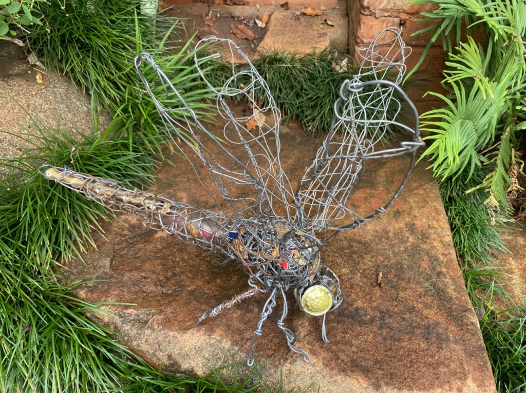 My dear friend, Master wire and recycling artist Johnson Zuze, creates creatures with such presence that you can feel their thoughts, and believe you inhabit their world completely – such as this masterful yet whimsical dragonfly which alights in my garden – I want to paint like this- maybe this dragonfly will translate to the walls of the massage room!!