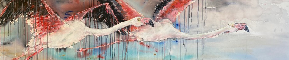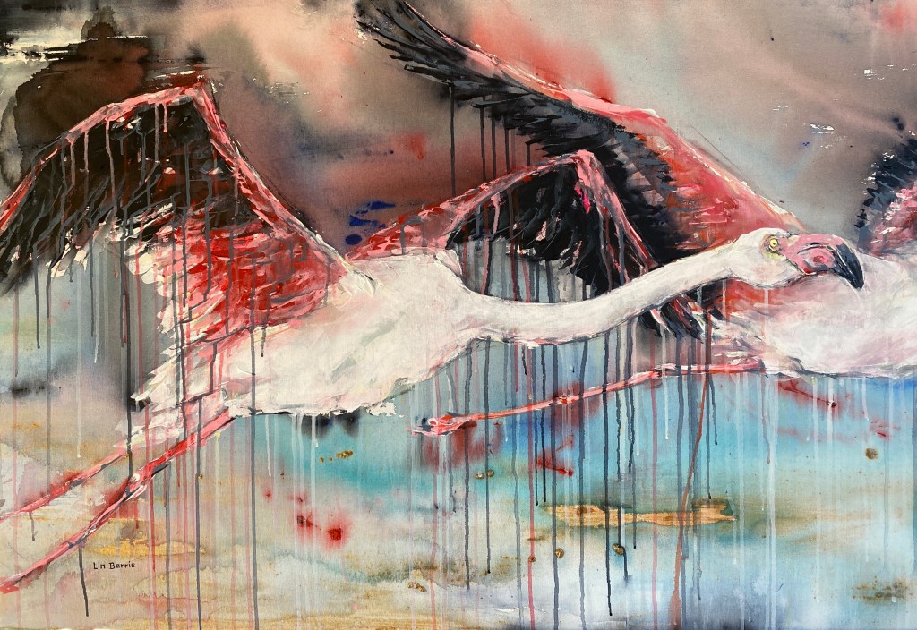 Lin Barrie, Flamingo Flight, All Things Connected, acrylic on canvas, 80 x 200 cm –