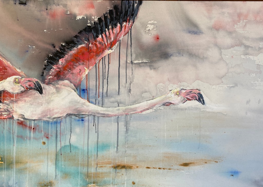 This painting is a portrayal of Flamingoes in flight, celebrating the biodiversity of ecosystems, especially on the West Coast of Africa, and the inter-connectedness of all things…